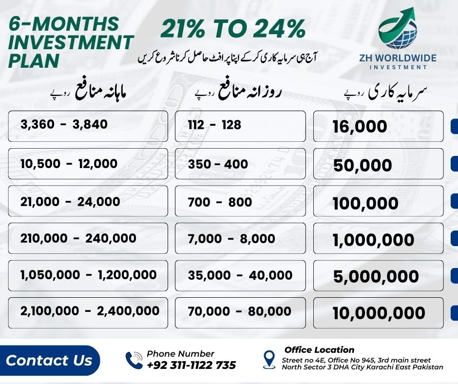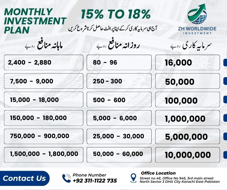 محفوظ سرمایہ کاری: آپ کا پیسہ ریئل اسٹیٹ، زمین اور سونے جیسے قابل اعتماد شعبوں میں لگایا جاتا ہے۔ ماہانہ یا سالانہ منافع: آپ کو باقاعدگی سے منافع حاصل ہوتا ہے، بغیر کسی محنت کے۔ ماہرانہ رہنمائی: کمپنی کے تجربہ کار افراد ہر قدم پر آپ کی مدد کرتے ہیں۔ کم خطرہ: تین سال سے زائد تجربے کی وجہ سے کمپنی خطرات کو سمجھداری سے سنبھالتی ہے۔ بین الاقوامی روابط: آپ خلیجی ممالک اور دیگر ممالک کے کاروباری نیٹ ورک سے فائدہ اٹھا سکتے ہیں۔ آسان طریقہ سے کامیاب بنیں آپ کو امیر یا کاروباری ماہر ہونے کی ضرورت نہیں۔ ZH Worldwide Investment ایسے سرمایہ کاری کے منصوبے پیش کرتی ہے جو کم سرمائے سے بھی شروع کیے جا سکتے ہیں۔ آج ہی سرمایہ کاری کر کے آپ ایک محفوظ اور کامیاب مستقبل کی طرف قدم بڑھا سکتے ہیں۔ باقاعدہ منافع اور ماہر رہنمائی کے ذریعے آپ اپنے خواب پورے کر سکتے ہیں۔ کا یقین ہے کہ ہم سب کی ترقی ایک ساتھ ممکن ہے — آپ کی کامیابی، ہمارا مشن ہے۔